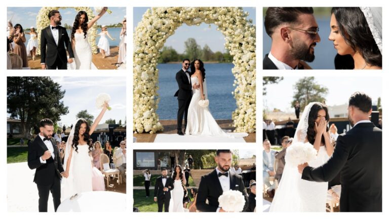 Evenimentul s-a desfășurat într-un decor ales special, pe malul lacului Buftea, într-un format restrâns care a inclus familia și prietenii intimi. O altă derogare de la tradiție a fost modul în care au fost întâmpinați nuntașii. Mirii au ales să nu respecte ritualul primirii invitaților la intrare, preferând să se bucure de petrecere încă de la început.